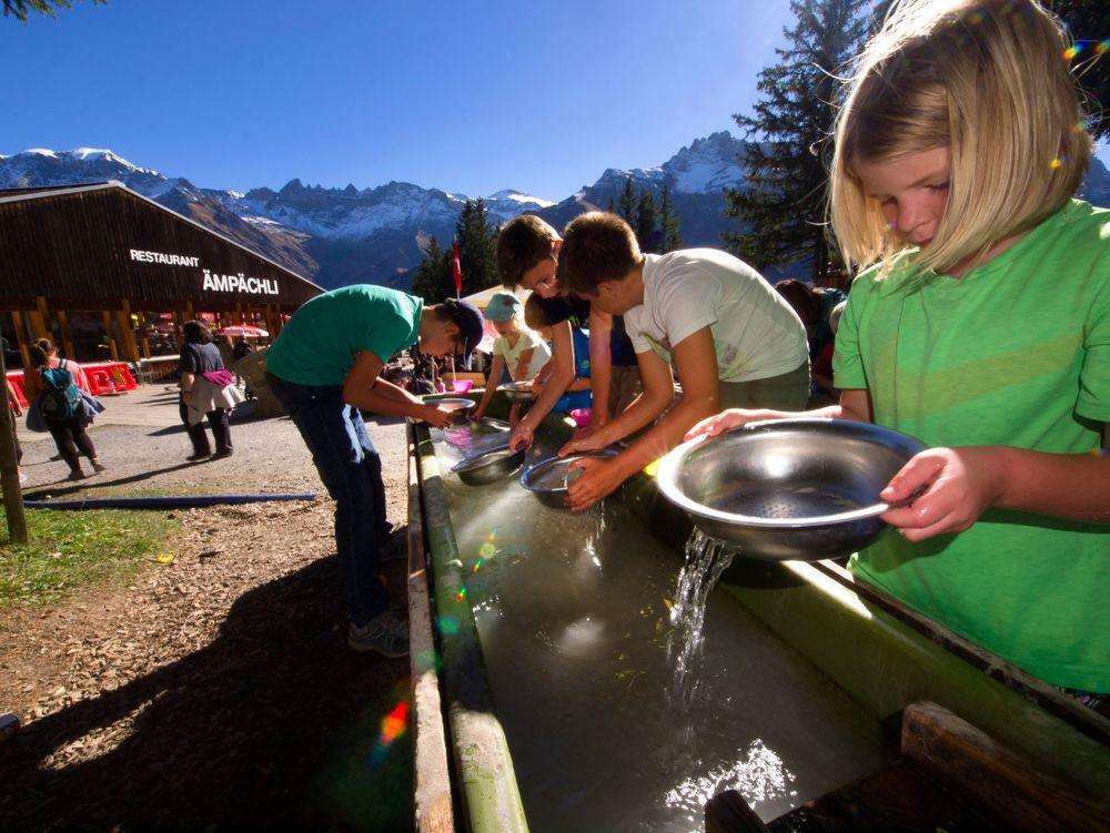 Spannende Goldsuche in Elmar's Goldmine beim Bergrestaurant Ämpächli. Kinder erhalten beim Bergrestaurant gratis ein Goldsieb. mit Schale und schon gehts auf zum Goldwaschen. In zwei grossen Holzbecken sind Nuggets im Sand vergraben. Die erfolgreichen Goldgräber können ihren Fund im Restaurant gegen eine süsse Überraschung eintauschen.